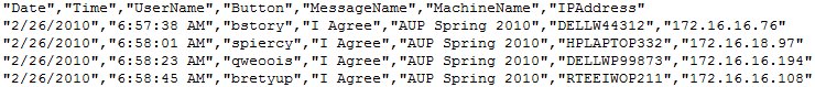 This is an example of the log output to a comma-delimited log file, similar to the file your users will automatically create when running Message Manager Deluxe.